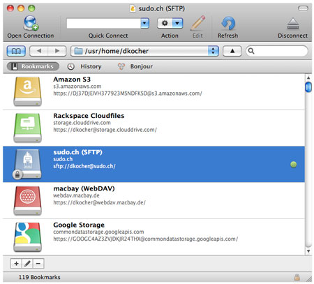 Cuối cùng nhưng không kém phần quan trọng, Cyberduck còn hỗ trợ nhập bookmark từ các ứng dụng bên thứ ba, kiểm tra lịch sử toàn bộ máy chủ đã ghé qua cùng với timestamp truy cập gần nhất và tự động khám phá các dịch vụ FTP, WebDAV trên mạng cục bộ.