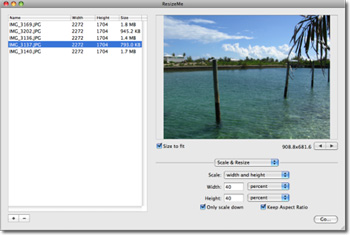 ResizeMe là một ứng dụng dễ dàng sử dụng sẽ giúp bạn xử lý hàng loạt các hình ảnh trên máy Mac của bạn. Bạn có thể chỉnh sửa hàng nghìn bức ảnh ngay lập tức với ResizeMe. Bạn có thể tạo các hình nhỏ cho trang web của bạn, giảm kích thước file ảnh, hoặc thay đổi kích thước để phù hợp với một kích thước nhất định với việc vẽ tỉ lệ của ResizeMe. Ảnh của bạn đang ở chế độ chân dung nhưng bạn muốn có phong cảnh, ResizeMe cho phép bạn quay các hình ảnh để tạo một góc nhìn mới cho hình ảnh của mình. Bạn cũng có thể thêm hình mờ, lật ngược hình ảnh để tạo một bóng gương cho nó.